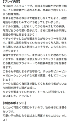 今日はクリスマス・イヴ。雨降る街は賑やかお祭り騒ぎ。そんな喧騒から逃れるため、早めに予約をしてしまう独身貴族。 簡単予約があるおかげで電話をしなくてもよく、確認電話も不要なためすぐに予約してしまいました。 ホテル入室後、しばらくしてから始めましての挨拶。 写真どおり